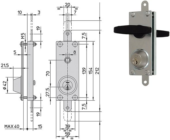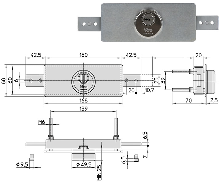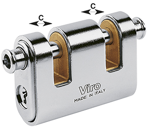 Blocca catena per catene di sezione fino a mm.10,5. Due aste di chiusura indipendenti con testa riportata contro lo strappo. Corpo in ottone massiccio. Corazza (blindatura) in acciaio cementato, temprato, ramato, nichelato e cromato. Barilotto a 5 pistoncini. Con 2 chiavi a profilo Viro Top Security.