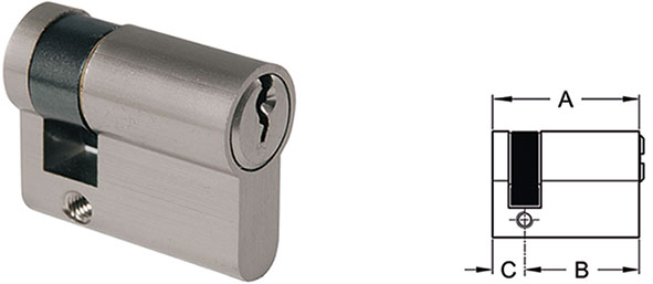 Mezzi cilindri profilo europeo da infilare in ottone NICHELATO. Camma DIN sporgente. In dotazione 3 chiavi nichelate (grezza ricambio ns.cod.880050).