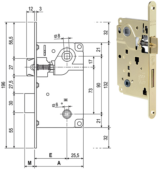 Serratura infilare per porte BAGNO con scrocco e catenaccio. Interasse mm.90. Frontale mm.18 con bordo tondo. Quadro da mm.6. Scrocco reversibile. Per girare lo scrocco: sollevare la levetta di blocco, spingerlo all'interno della serratura e ruotare. Abbassare quindi la levetta di blocco. Da abbinare: incontri AGB CENTRO frontale 18 ns.cod.860838-860839-860840.