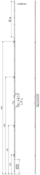 Serratura multipunto a cilindro sagomato. Per porte esterne ad un'anta con lavorazione a battente. Interasse mm.85. Frontale larghezza mm.16, altezza mm.2400. Quadro maniglia mm.8.