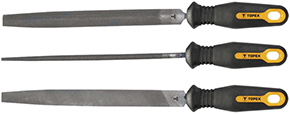 Serie 3 lime per metallo forma: piatta, mezza tonda, tonda. In acciaio T12. Lunghezza mm.200. Manico in plastica antiscivolo. Confezione blister.