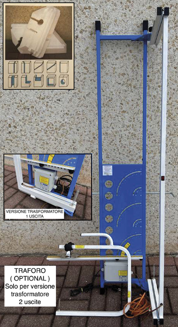 Taglierina a filo caldo per tagli, tracce ed incassi ad U massimo cm.120x60x20. Trasformatore con una sola uscita da 230V 200VA 40V. Utilizzabile senza la necessit? di essere ancorata al ponteggio ma semplicemente appoggiata al muro, anche lungo i corridoi sul piano di calpestio dei ponteggi accanto all'operatore.