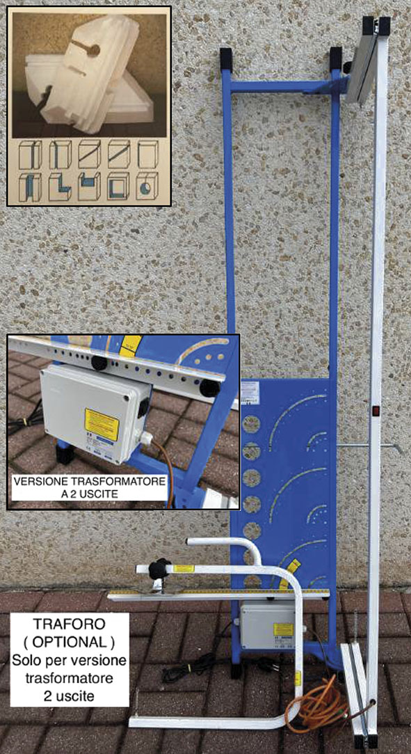 Taglierina a filo caldo per tagli, tracce ed incassi ad U max cm.120x60x20. Trasformatore 230V 200VA con doppia uscita: la 1? da 40V per alimentare la taglierina; la 2? da 12V per alimentare il traforo (ns.cod.886820 non incluso) che consente tagli passanti sullo spessore del pannello max cm.20. In grado di realizzare tutti i tipi di tagli necessari in fase di montaggio del termo cappotto.