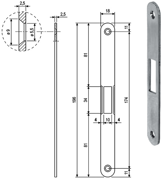 Contropiastra in acciaio bordo tondo. Larghezza mm.18. Lunghezza mm.196. Spessore mm.2,5. Per aperture sia destre che sinistre. Da abbinare a serrature AGB MEDIANA.
