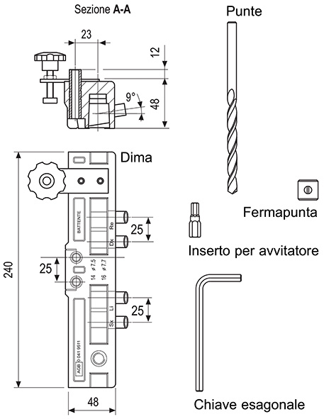Dime per cerniere registrabili 3D. Applicazione a battente. KIT con accessori: 2 dime + 1 punta d.mm.7,5-7,7 + 1 punta d.mm.7,7 + 2 fermapunte + 3 chiavi esagonali + 2 inserti per avvitatore.