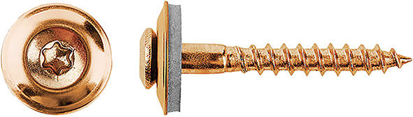 Per coperture. Vite legno testa goccia sego, impronta torx T20, assemblata con rondella metallo/EPDM. Vite acciaio inox A2 (AISI 304) ramata. Rondella rame / EPDM. Vite d.mm.4,5x35L. Rondella d.mm.20.