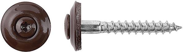 Per coperture. Vite legno testa goccia sego, impronta torx T20, assemblata con rondella metallo/EPDM verniciata testa di moro RAL 8017. Vite acciaio inox A2 (AISI 304). Rondella acciaio inox A2 (AISI 304) / EPDM. Vite d.mm.4,5x35L. Rondella d.mm.20.