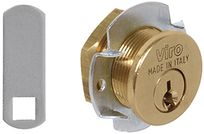 Serrature universali con barilotto decentrato, per mobili metallici e in legno. Corpo in ottone lucido interamente filettato, fresato su un lato per evitare la rotazione. Chiave estraibile in posizione verticale. Giro di 180?. Cilindro d.mm.20. Con 2 chiavi a profilo Viro. Attacco levetta Q.mm.7. Al bisogno abbinabile a levette ns.cod.844158-70-71-72-75-76-86.